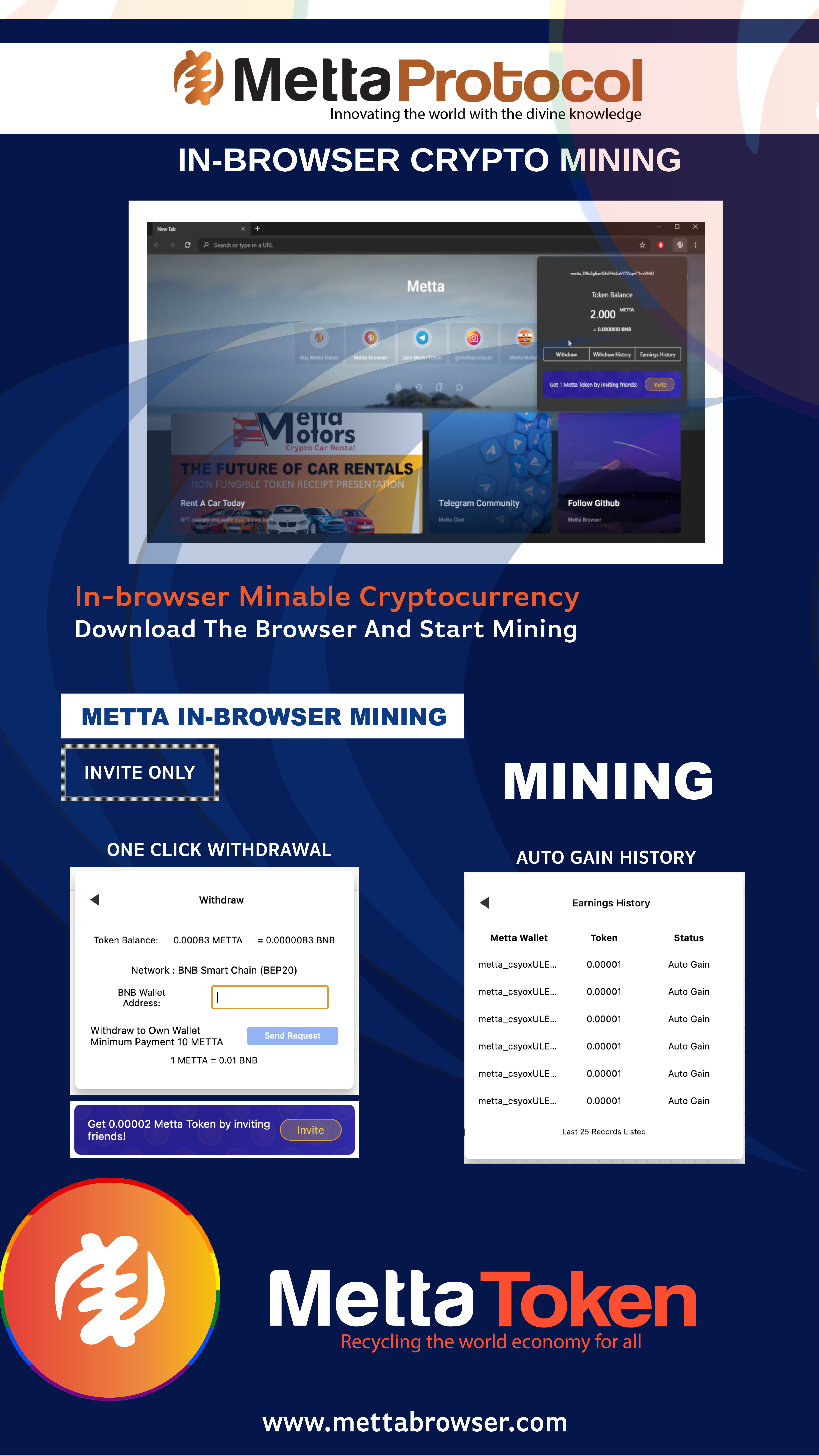 Metta Browser is a web browser designed with blockchain and cryptocurrency functionalities in mind, it allows users to generate Metta Protocol Tokens daily for using the browser. Metta Browser features an in-browser wallet names Metta Wallet.